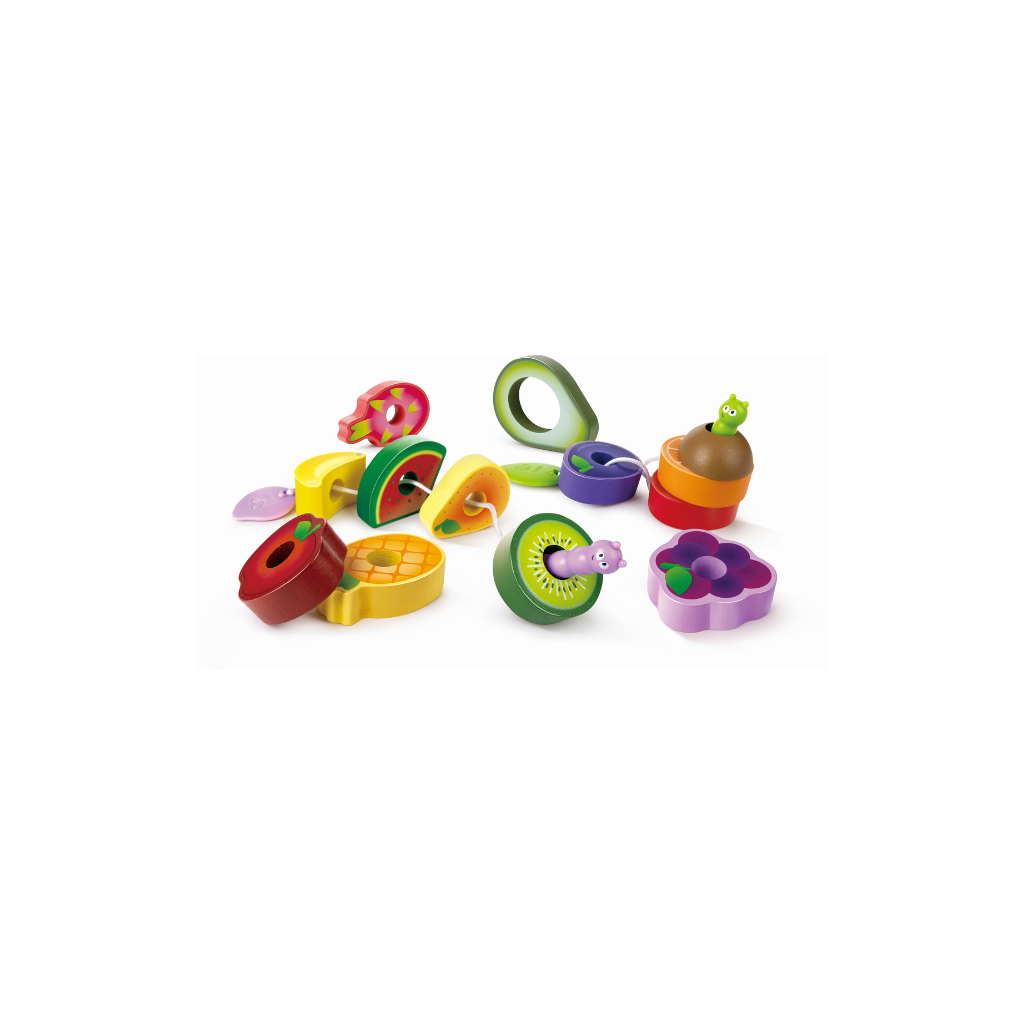 Περιλαμβάνει δύο κάμπιες με κορδόνια και 13 διαφορετικά φρούτα για να τα τσιμπήσουν.